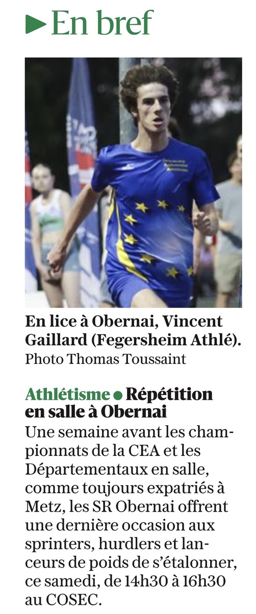 Les SR Obernai Athlétisme ont organisé un meeting indoor pour les catégories U16 (minimes) à seniors dédié aux épreuves de sprint, de haies et de lancer de poids ce samedi 03 janvier 2026 après-midi dans la salle du COSEC qui jouxte le stade municipal d'Obernai.